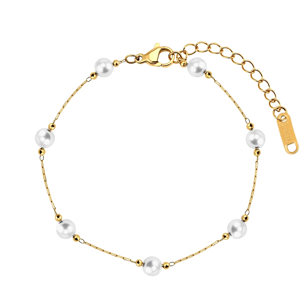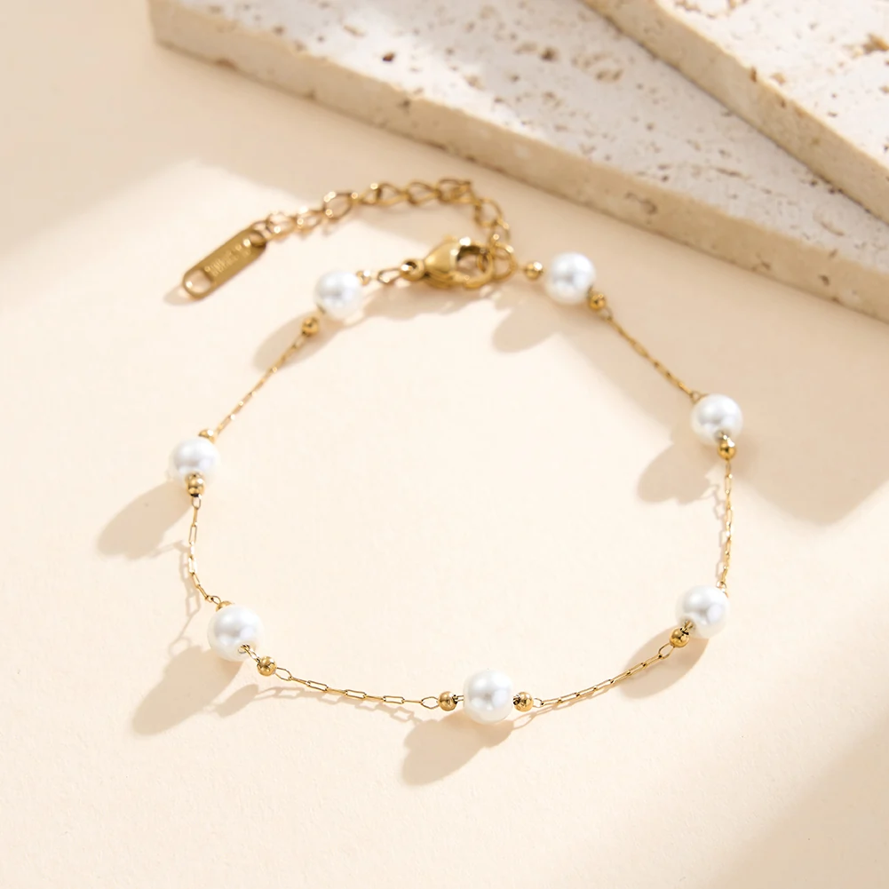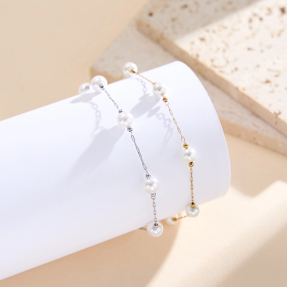Brățara Tide combină perle shell albe cu bile metalice aurii și un lanț paperclip delicat, într-un ritm vizual care aduce liniștea apei în fiecare zi. Placarea aur 18K îi conferă căldură și eleganță discretă, potrivită atât pentru momente casual, cât și pentru ocazii speciale.