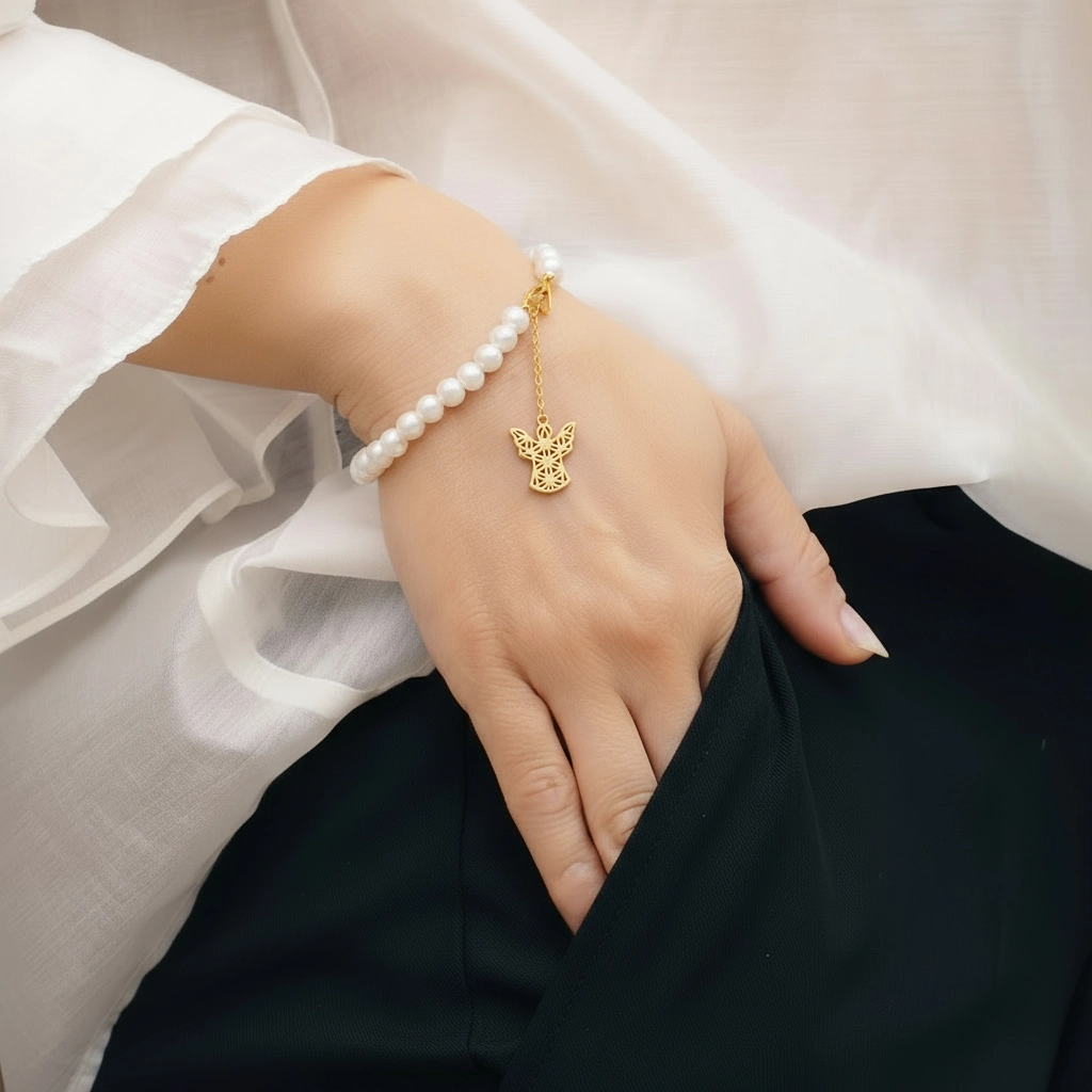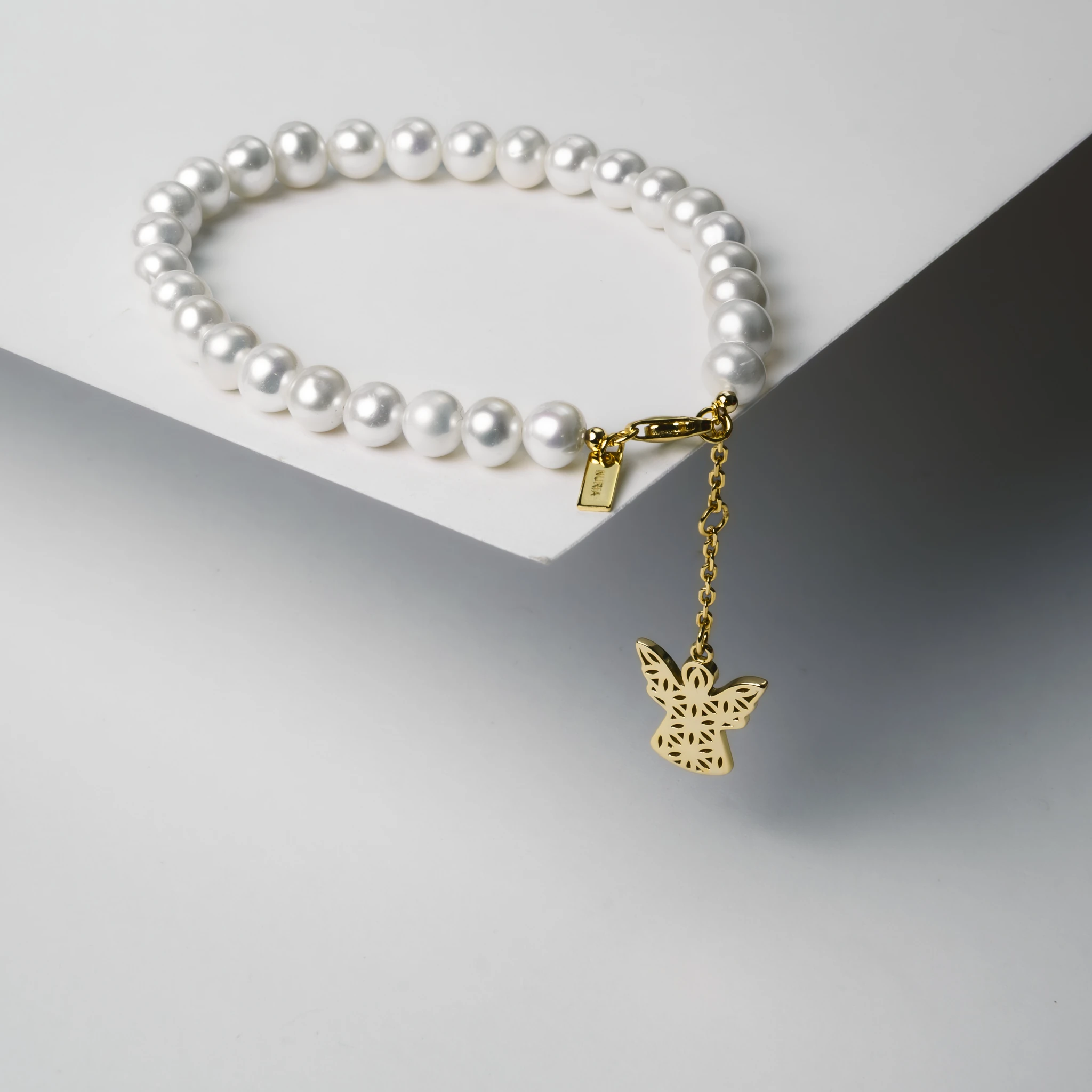 Brățara Înger din colecția INNER CODE este alcătuită dintr-un șir de perle naturale de cultură. Sistemul de închidere, lănțișorul de susținere și simbolul sunt realizate din argint placat cu aur care îl protejează de uzură și îi oferă o strălucire suplimentară. Propunerea noastră? O selecție unică de forme, alese pentru a exprima un stil fermecător – feminitate delicată, sensibilitate romantică. Linii simple și inserții cu cristale de zirconiu ce creează o impresie de tinerețe atemporală. Astfel, bijuteriile NURIA reprezintă alegerea potrivită atât pentru zi, cât și pentru seară.
