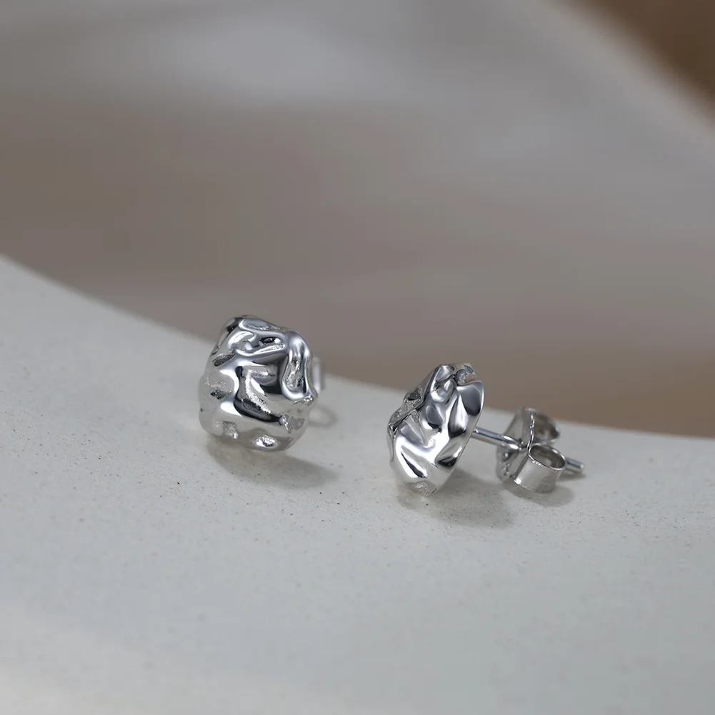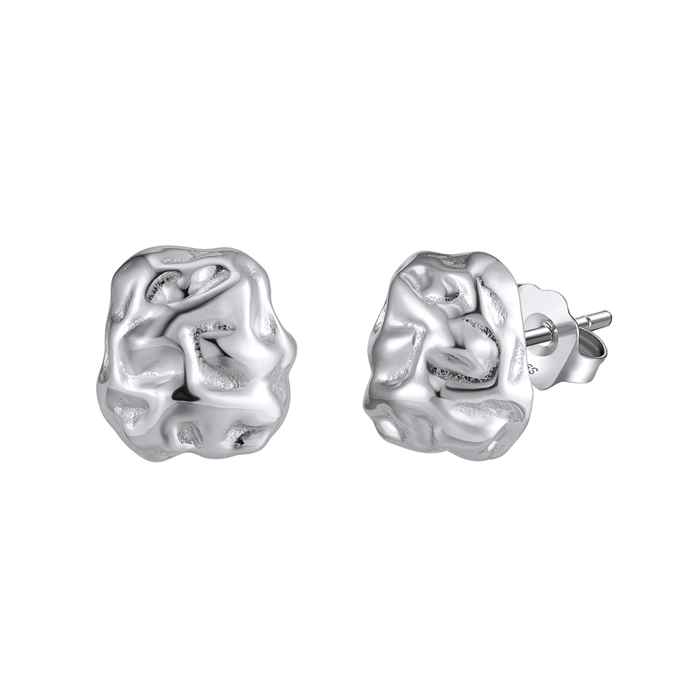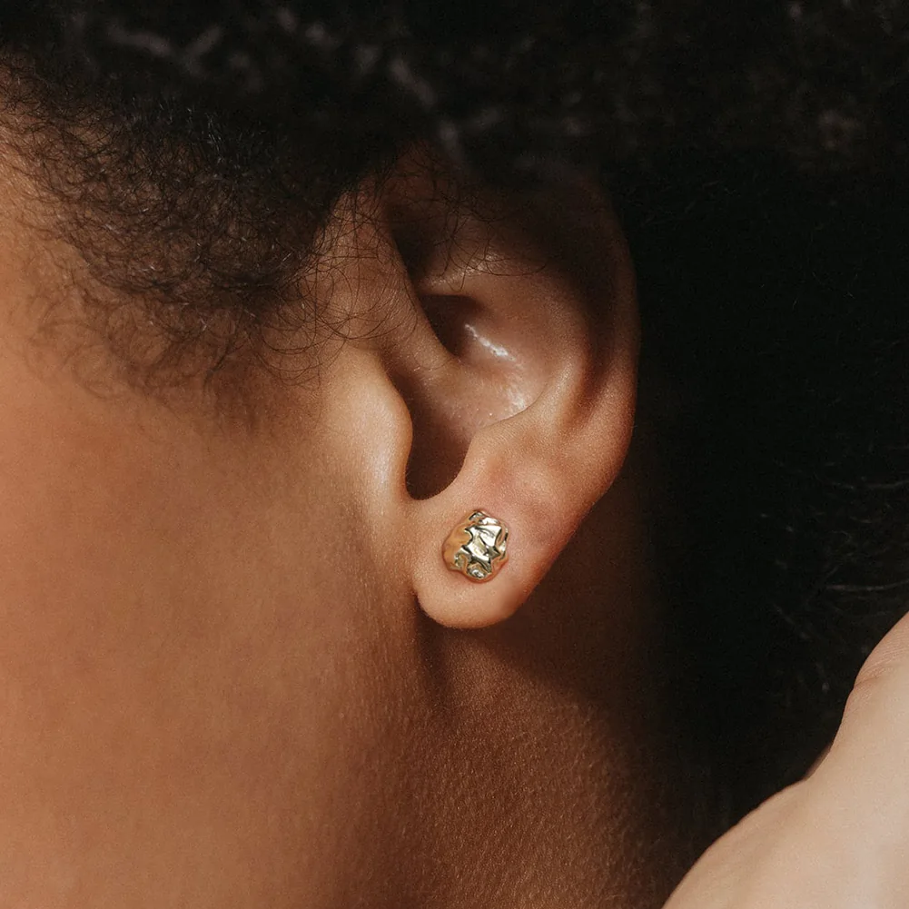 O suprafață liberă, cu reliefuri și adâncituri distribuite organic, care reflectă lumina diferit din fiecare unghi. Cercei stud cu un caracter sculptural distinct, pentru femeia care caută un design cu substanță dincolo de convenții.