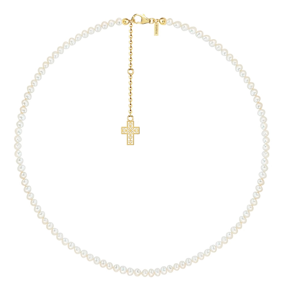 Colier delicat și elegant, realizat din perle naturale de cultură de dimensiuni mici. Ideal pentru un look discret, feminin și rafinat, purtat individual sau în combinații layering.