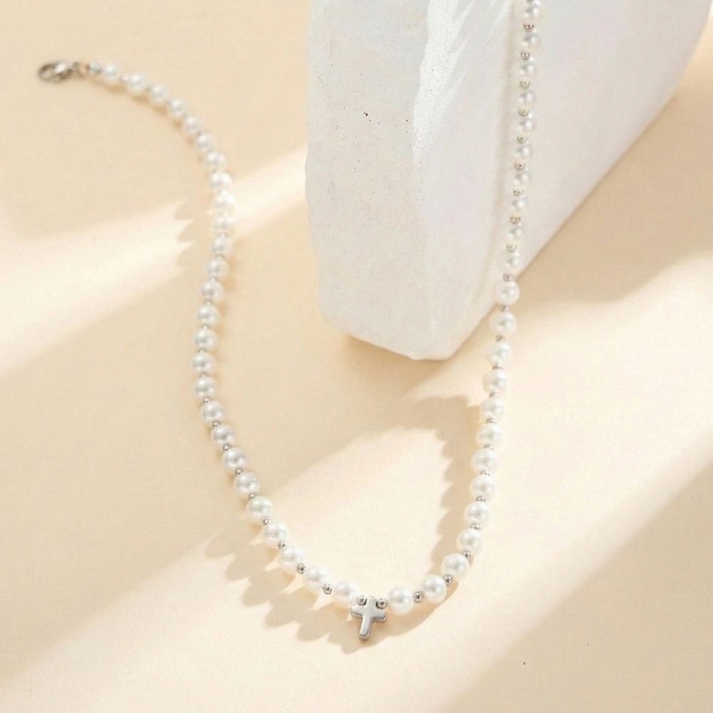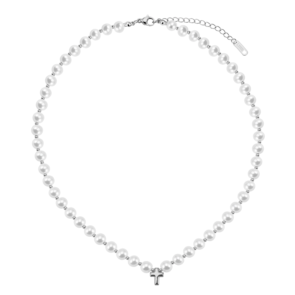 Un colier construit din ritm și sens. Perle shell albe de 6 mm înșirate continuu pe tot colierul, cu bile argintii mici intercalate regulat, și o cruce argintie de 7 mm în centru — discretă, dar prezentă. Colierul Cruz îmbină esteticul cu simbolicul într-o compoziție care funcționează atât ca bijuterie de zi cu zi, cât și ca piesă pentru ocazii cu încărcătură emoțională.