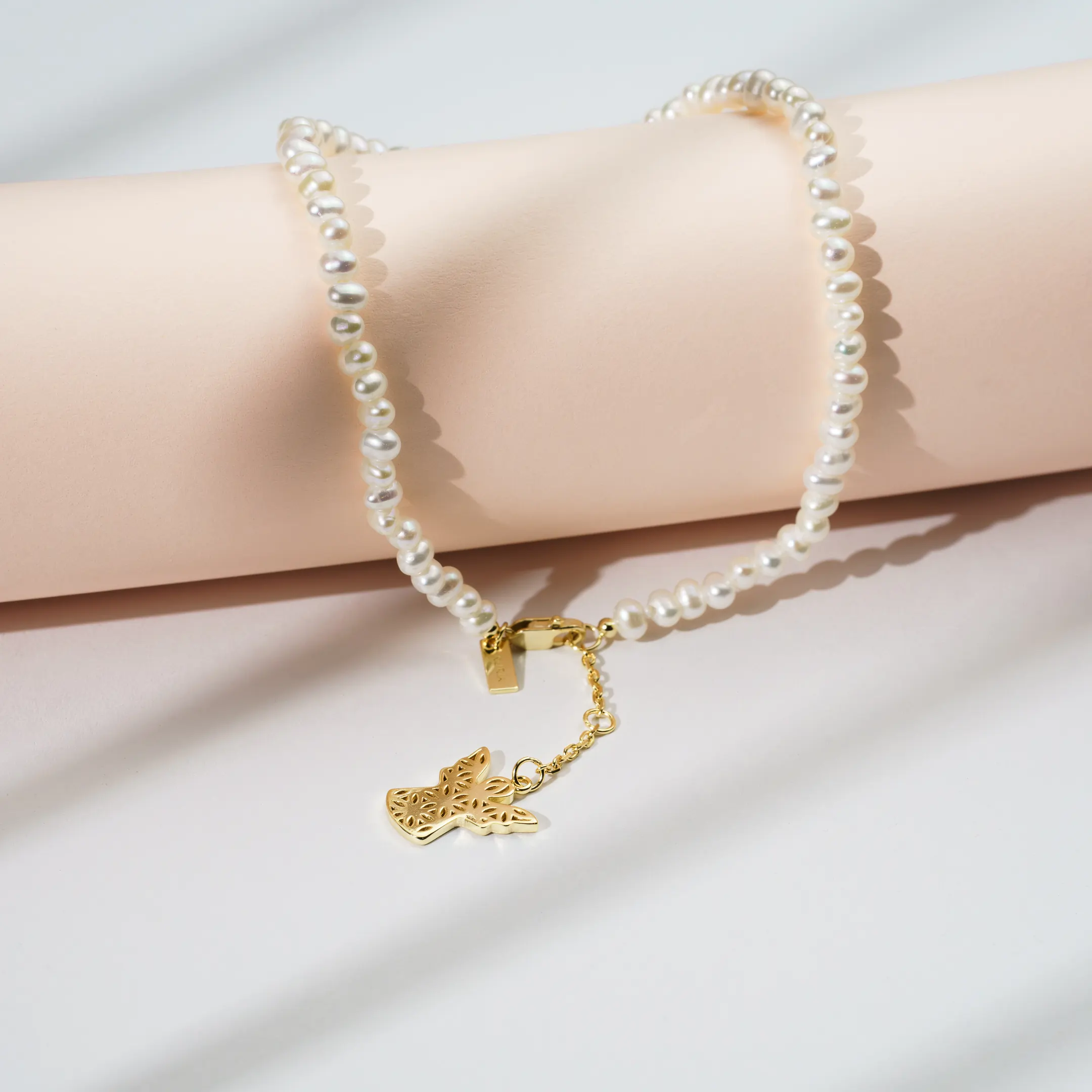 Brățara de picior Înger din colecția INNER CODE este alcătuită dintr-un șir de perle naturale de cultură. Sistemul de închidere, lănțișorul de susținere și simbolul sunt realizate din argint placat cu aur.