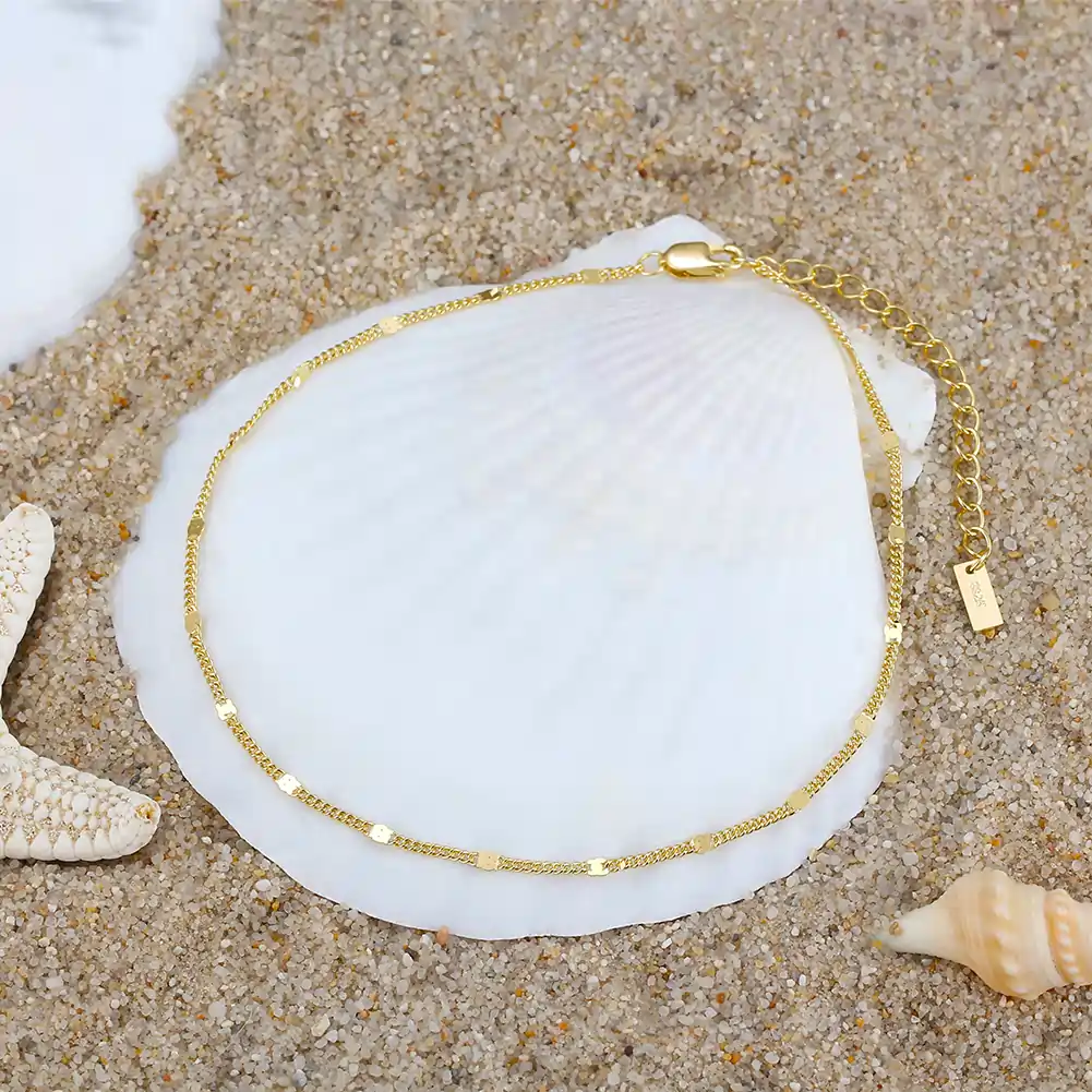 Satellite Auriu este o brățară de picior cu personalitate construită în ritm. Lanțul curb fin alternează cu mici elemente pătrate distribuite uniform, care prind lumina în puncte distincte și creează o sclipire discontinuă, aproape ca o constelație la gleznă.