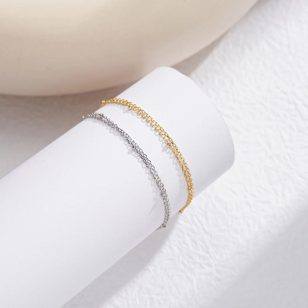 Două lanțuri fine suprapuse, cu bile aurii distribuite ritmic de-a lungul fiecăruia. Un design care creează efectul de layering de la sine, cu o delicatețe și o feminitate greu de ignorat. O brățară care se simte bine pe încheietură din prima zi.
