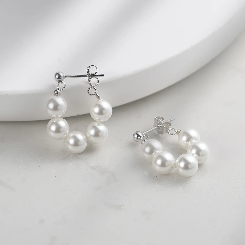 Arc Argintiu sunt cercei care își construiesc eleganța din repetare. Patru perle shell rotunde, înșirate în arc și suspendate de un tift argintiu cu bilă discretă, desenează împreună o formă delicată la ureche, vizibilă din orice unghi.