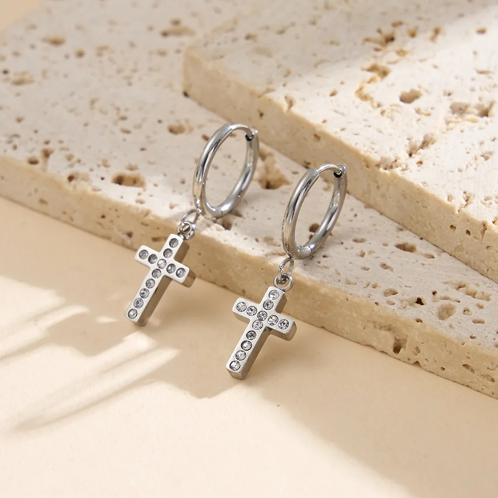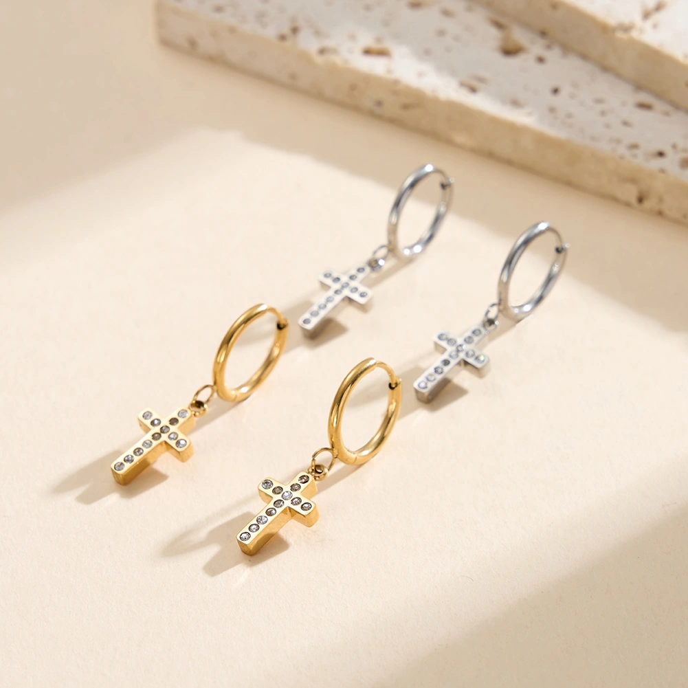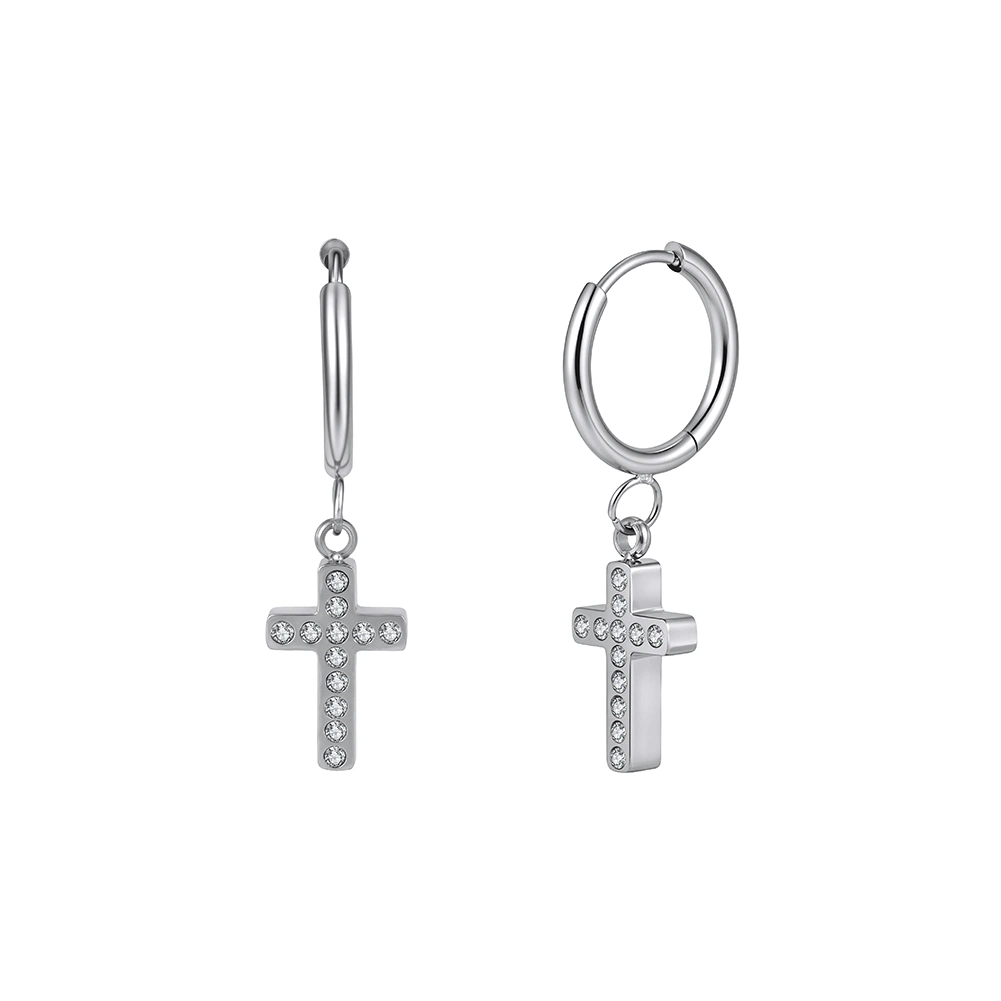 Crucea este unul dintre cele mai vechi simboluri purtate ca bijuterie — și cerceii Cruz îl reinterpretează cu discreție și eleganță. O cruce de 8 mm pavată cu cristale de zirconiu atârnă liber dintr-o verigă huggies argintie, creând un contrast între soliditatea formei și strălucirea fină a cristalelor.