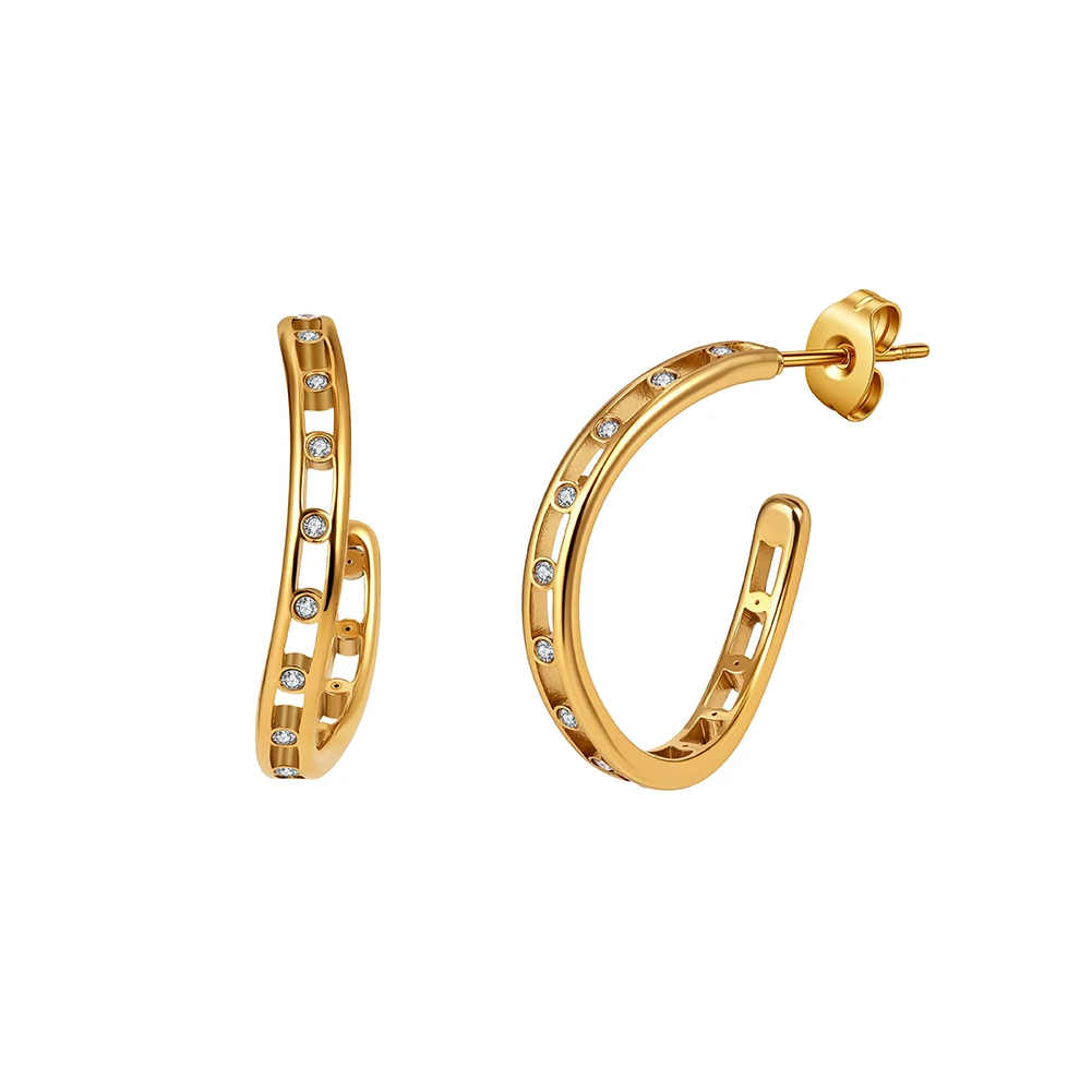 Cerceii Rail combină cristale de zirconiu în setare bezel cu un corp dublu auriu cu deschideri rectangulare, într-un design tehnic și rafinat care alternează metalul plin cu spațiul negativ. Placarea aur 18K îi conferă căldură și o prezență distinctă la ureche.