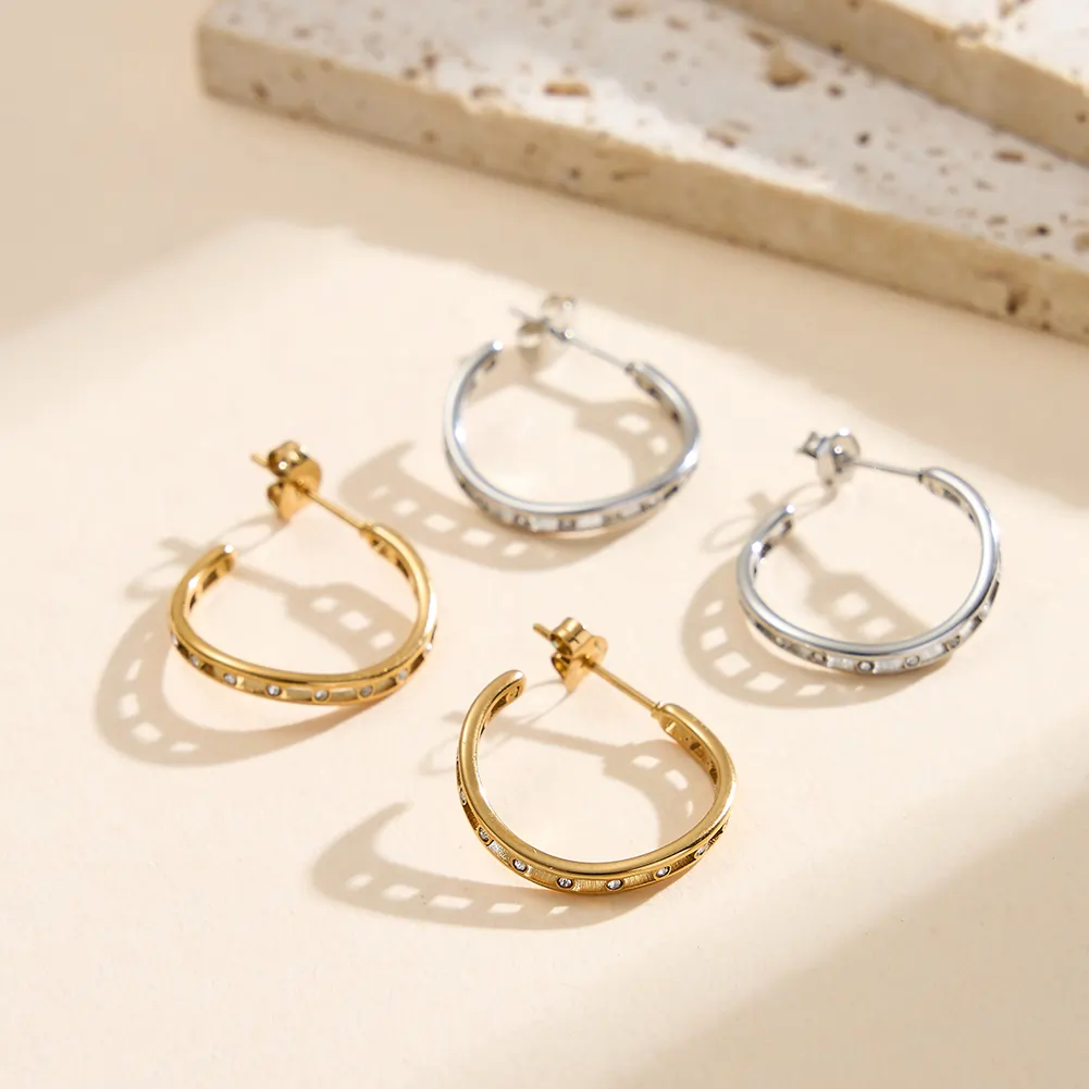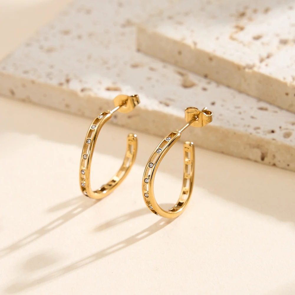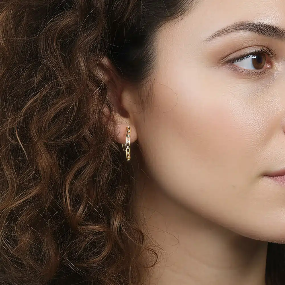 Există un ritm în modul în care sunt distribuiți — cristale de zirconiu în setare bezel plasate la intervale regulate de-a lungul unui corp creol dublu auriu, cu deschideri rectangulare între ele. Cerceii Rail construiesc un design tehnic și precis, în care strălucirea apare și dispare ritmic odată cu mișcarea.
