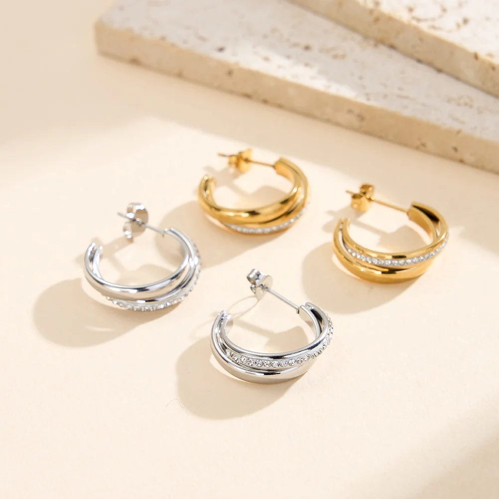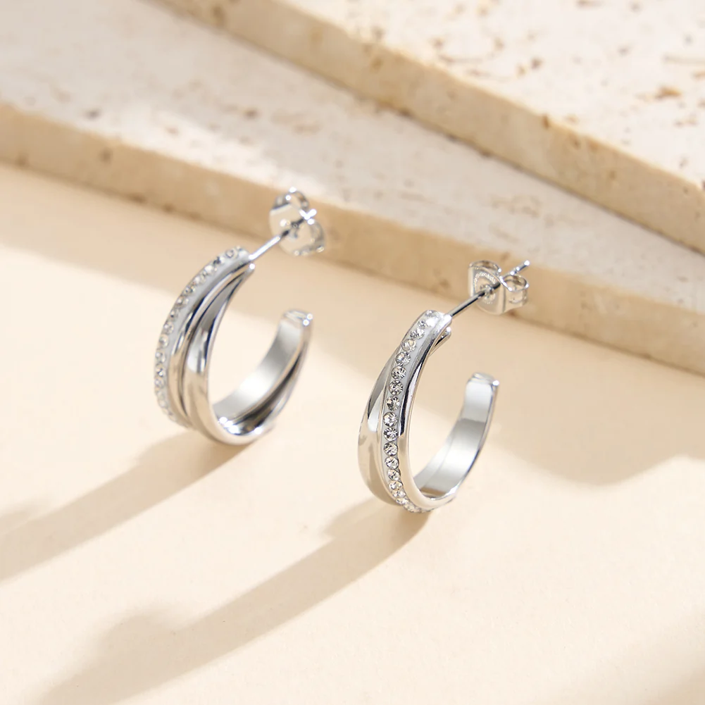 Cerceii Twist combină două benzi semicirculare argintii răsucite — una plată cu cristale de zirconiu în setare channel, una rotunjită și lucioasă — într-un design creol dublu care îmbină textura cu strălucirea într-un singur gest fluid. Finisajul lustruit îi conferă o prezență modernă și distinctă la ureche.