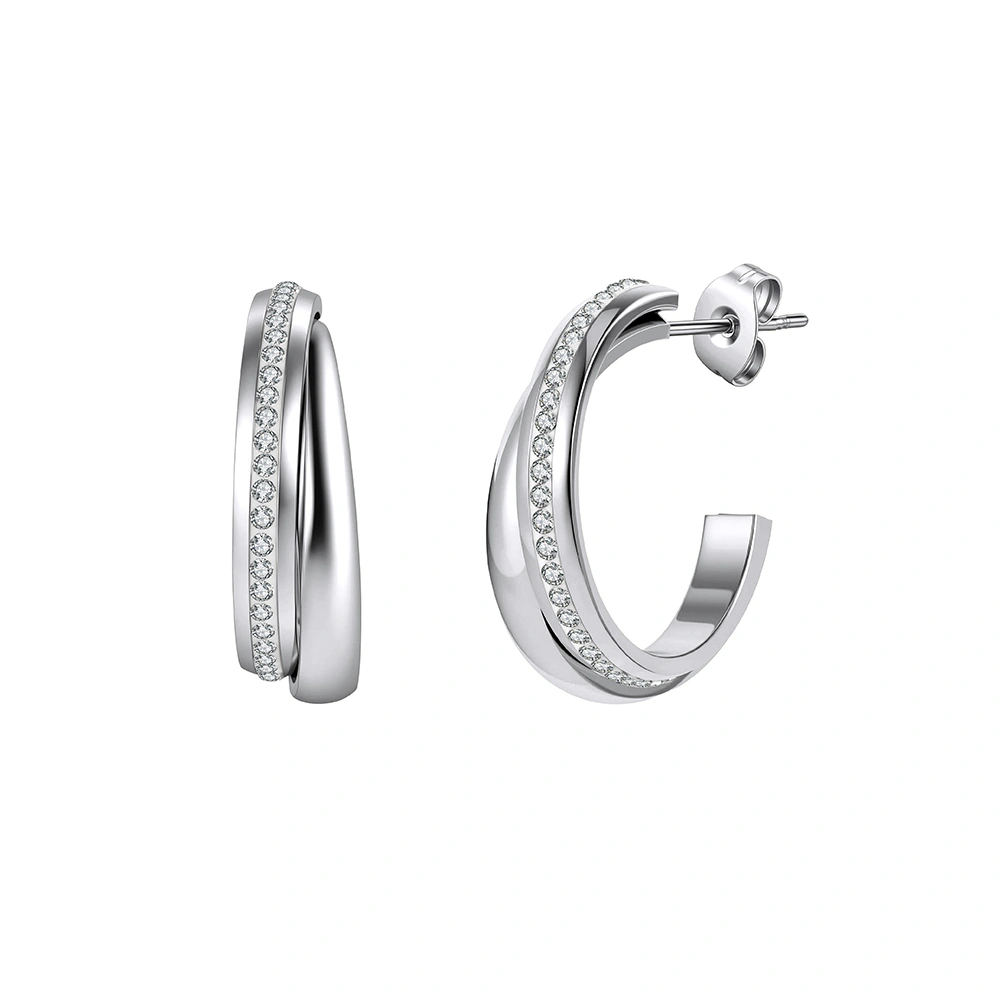 Două linii care se urmăresc, se împletesc și formează un întreg. Cerceii Twist sunt construiți din două benzi semicirculare argintii — una cu cristale de zirconiu în setare channel, una cu suprafață rotunjită și lucioasă — care se răsucesc una în jurul celeilalte, creând un volum elegant și o strălucire în mișcare.