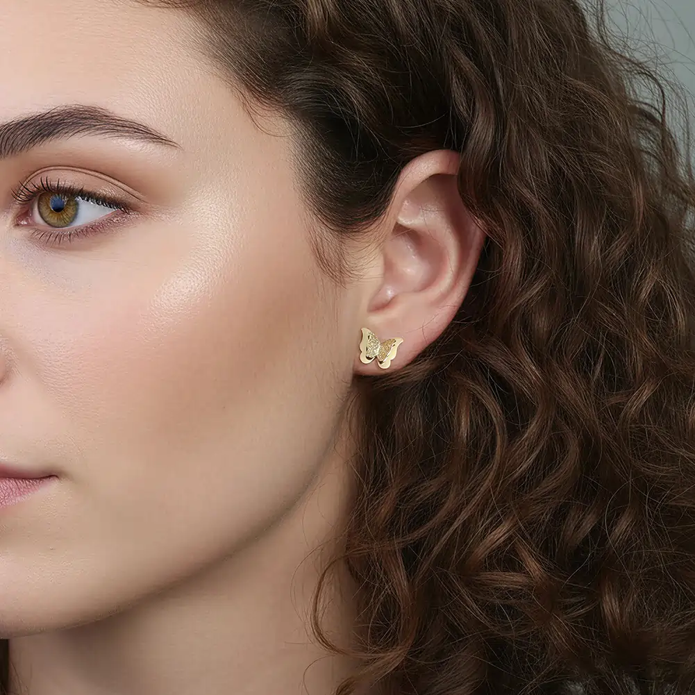 Fluturele este un simbol al transformării — și cerceii Flutter îl traduc vizual cu atenție la detaliu. Forma simetrică a aripilor combină un finisaj lucios pe conturul exterior cu o textură nisipată pe suprafața centrală, creând un contrast tactil și vizual care face din un cercel mic o piesă cu caracter.