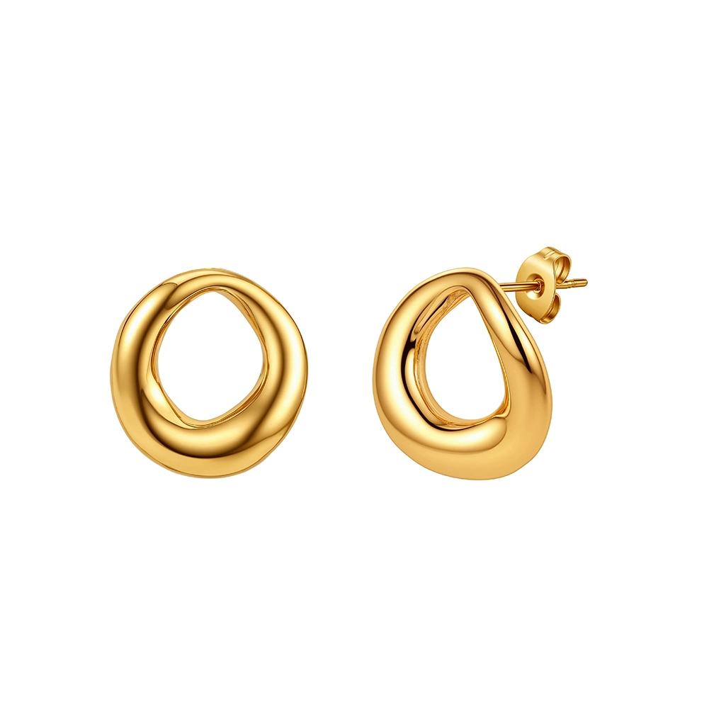 Un cerc care nu e perfect — și tocmai de aceea este interesant. Cerceii Ring sunt construiți dintr-un inel auriu voluminos cu contur organic, ușor neregulat, cu secțiune care variază pe parcursul formei și suprafață oglindă care captează lumina din unghiuri diferite.