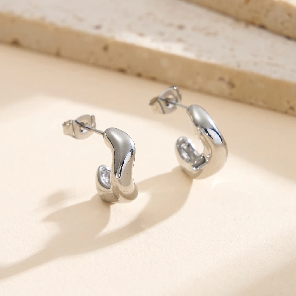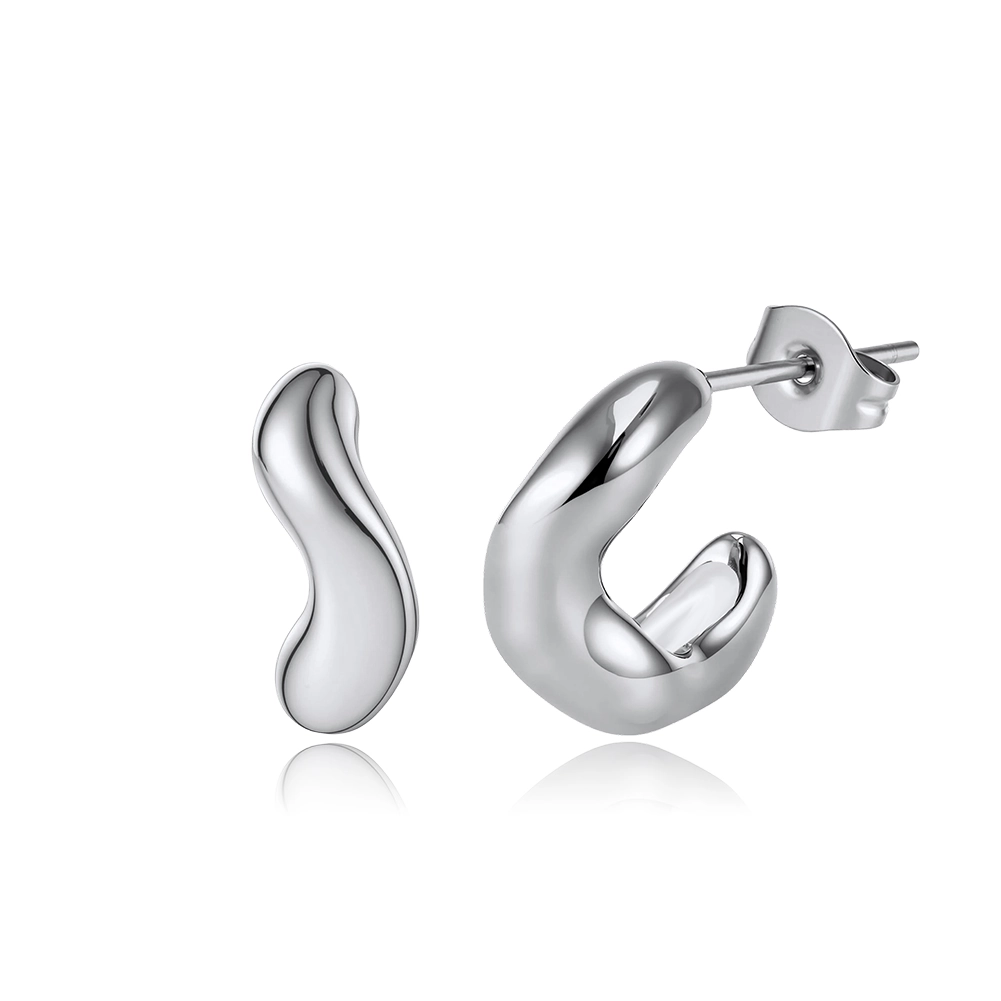 Forma care se schimbă pe parcurs — mai plină sus, mai fină spre capete — îi conferă cercelului Stream un caracter organic pe care geometria strictă nu îl poate reproduce. Un corp argintiu cu suprafață oglindă care urmărește o curbă liberă, fără unghiuri, fără întreruperi.
