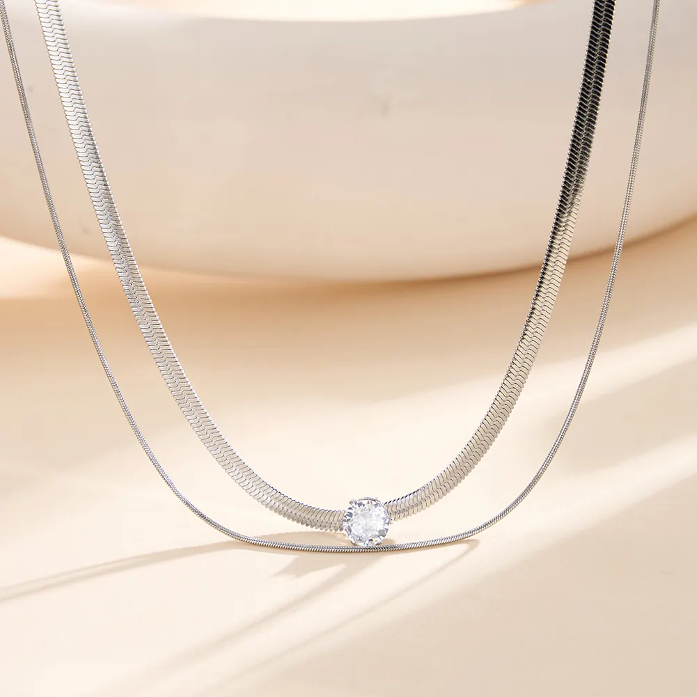 Colierul Duo combină două rânduri de lanț herringbone argintiu — unul lat și unul fin — cu un cristal de zirconiu alb în setare prong centrat pe lanțul lat, într-o compoziție stratificată gândită ca un singur obiect. Finisajul lustruit îi conferă o strălucire rece și coerentă. Rezistent la contactul cu apa.