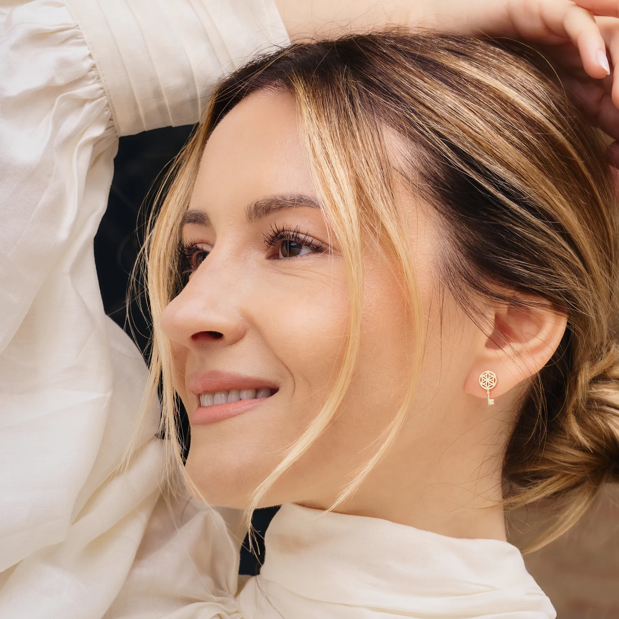 Cerceii Cheie Auriu din colectia INNER CODE sunt realizați din argint placat cu aur care îl protejează de uzură și îi oferă o strălucire suplimentară. Designul lor minimalist și simetric oferă un aspect elegant și echilibrat, potrivit atât pentru purtare zilnică, cât și pentru ocazii speciale. Propunerea noastră? O selecție unică de forme, alese pentru a exprima un stil fermecător – feminitate delicată, sensibilitate romantică. Linii simple și inserții cu cristale de zirconiu ce creează o impresie de tinerețe atemporală. Astfel, bijuteriile NURIA reprezintă alegerea potrivită atât pentru zi, cât și pentru seară.
