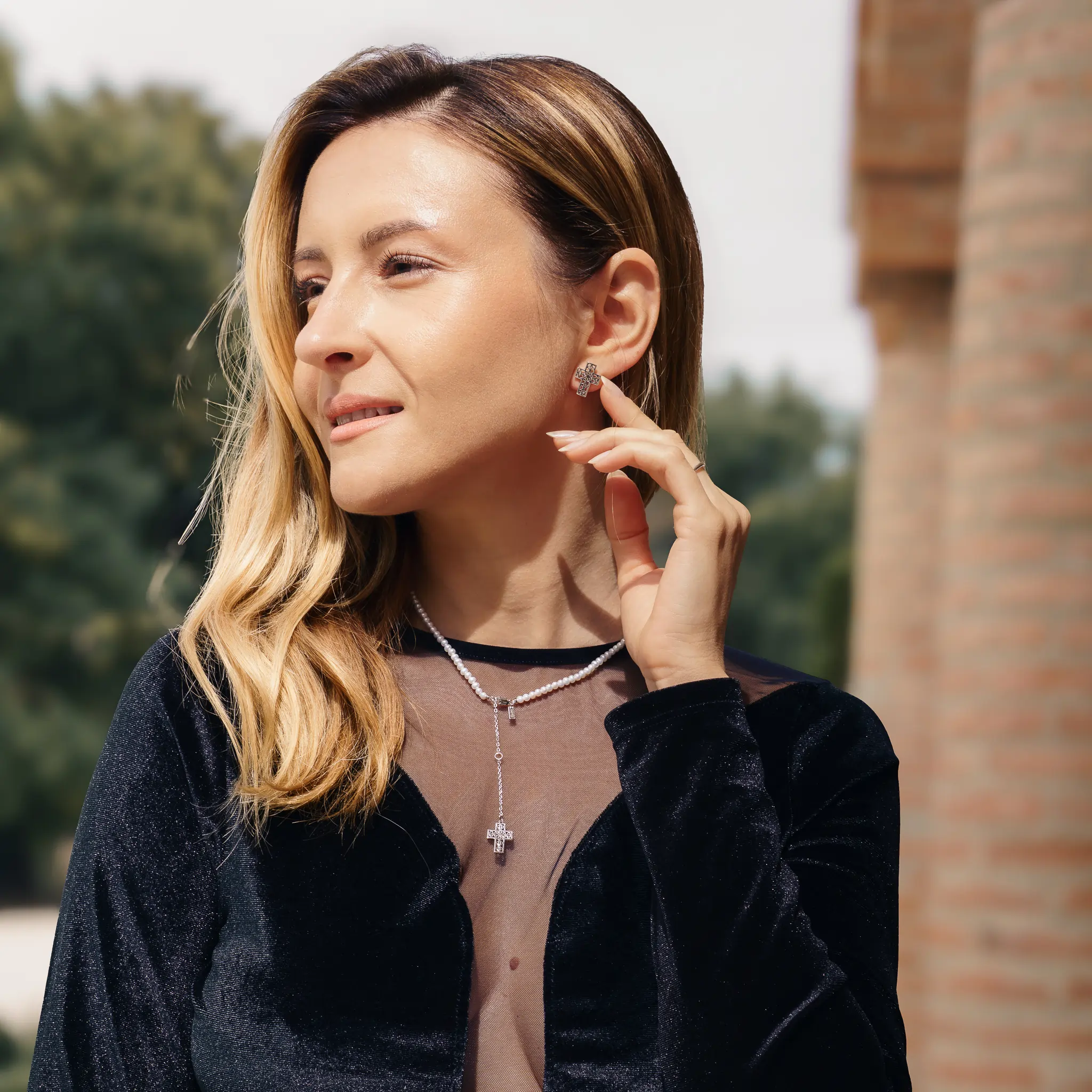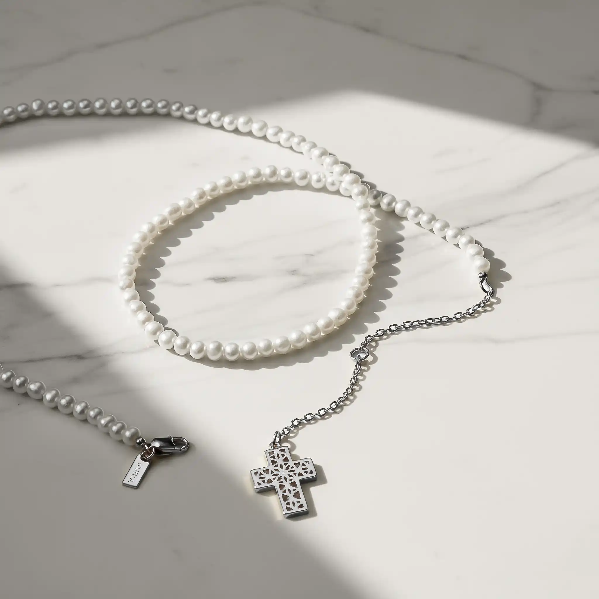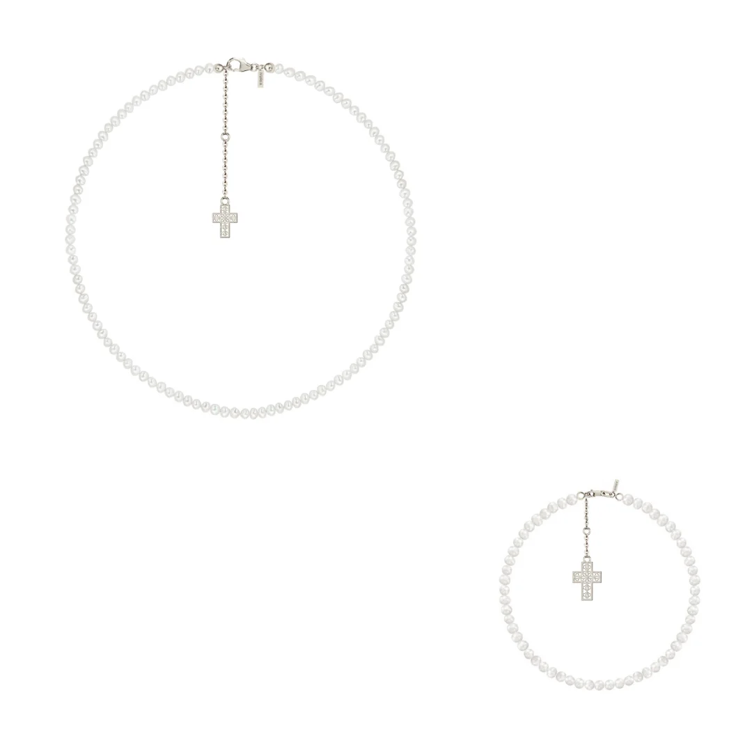 Colier Argint cu perle naturale de cultură mici Cruce ArgintiuColier delicat și elegant, realizat din perle naturale de cultură de dimensiuni mici. Ideal pentru un look discret, feminin și rafinat, purtat individual sau în combinații layering.