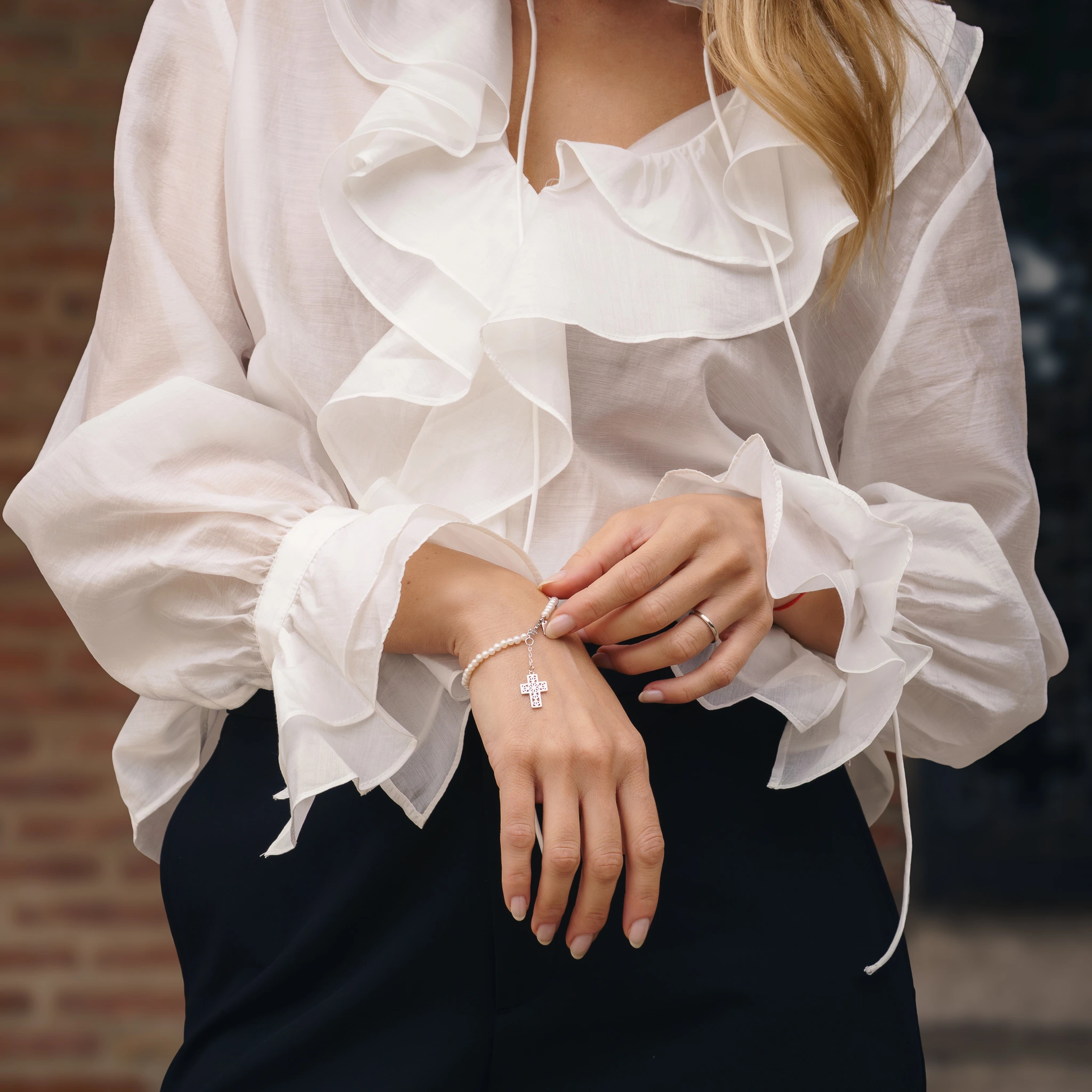 Brățară Argint cu perle naturale de cultură mici Cruce ArgintiuBrățară delicată și elegantă, realizată din perle naturale de cultură de dimensiuni mici. Designul combină armonios minimalismul contemporan cu simbolismul subtil, transformând brățara într-o bijuterie versatilă — potrivită atât pentru purtarea zilnică, cât și pentru ocazii speciale.