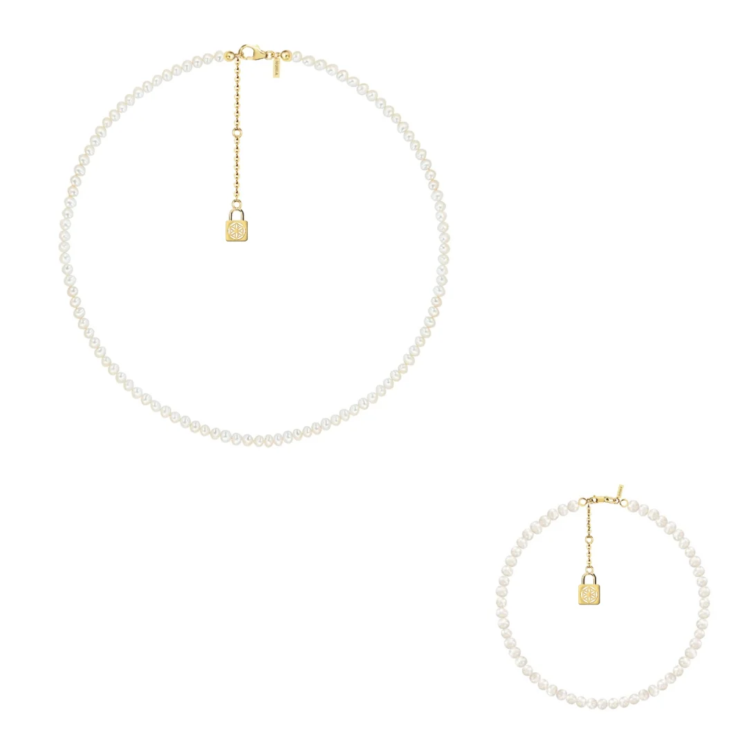 INNER CODE este alcătuită dintr-un șir de perle naturale de cultură. Sistemul de închidere, lănțișorul de susținere și simbolul sunt realizate din argint placat cu aur care îl protejează de uzură și îi oferă o strălucire suplimentară. Propunerea noastră? O selecție unică de forme, alese pentru a exprima un stil fermecător – feminitate delicată, sensibilitate romantică. Linii simple și inserții cu cristale de zirconiu ce creează o impresie de tinerețe atemporală. Astfel, bijuteriile NURIA reprezintă alegerea potrivită atât pentru zi, cât și pentru seară.