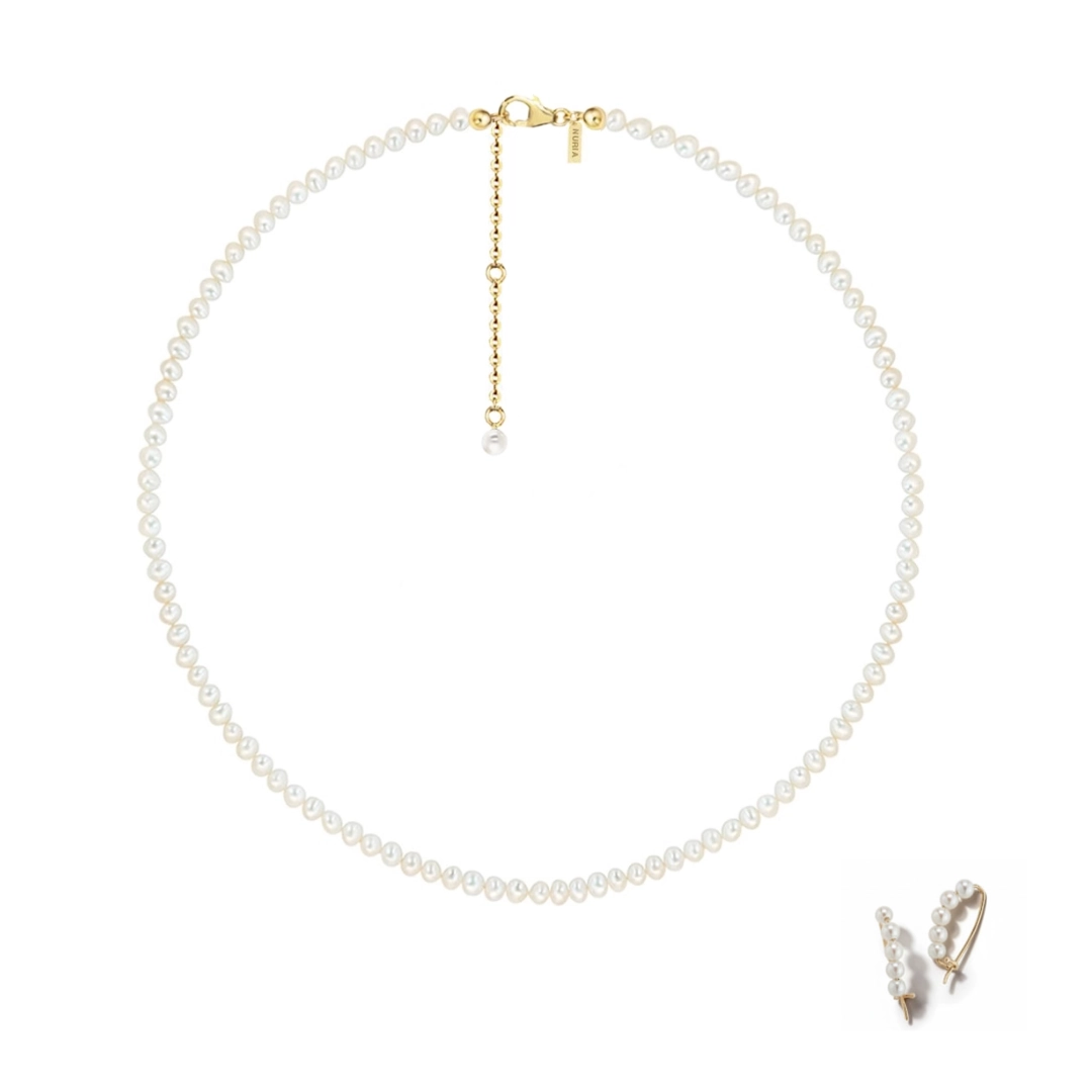 Colierul Small Pearl String este compus dintr-un șir de perle naturale de cultură. Sistemul de închidere este realizat din argint placat cu aur care îl protejează de uzură și îi oferă o strălucire suplimentară. Propunerea noastră? O selecție unică de forme, alese pentru a exprima un stil fermecător – feminitate delicată, sensibilitate romantică. Linii simple și inserții cu cristale de zirconiu ce creează o impresie de tinerețe atemporală. Astfel, bijuteriile NURIA reprezintă alegerea potrivită atât pentru zi, cât și pentru seară.