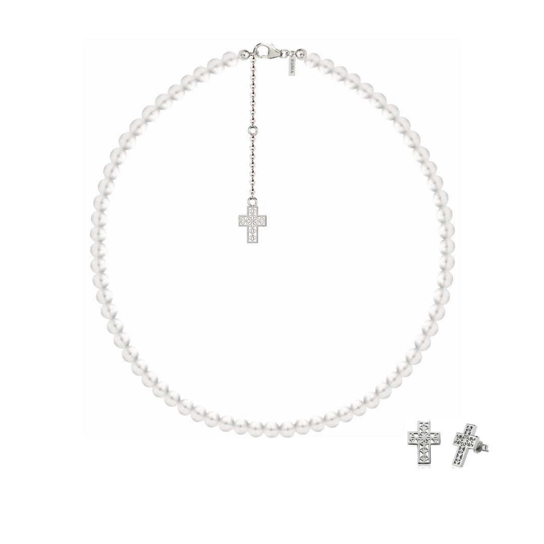 Set Colier și Cercei din argint cu perle naturale de cultură mari Cruce Argintiu