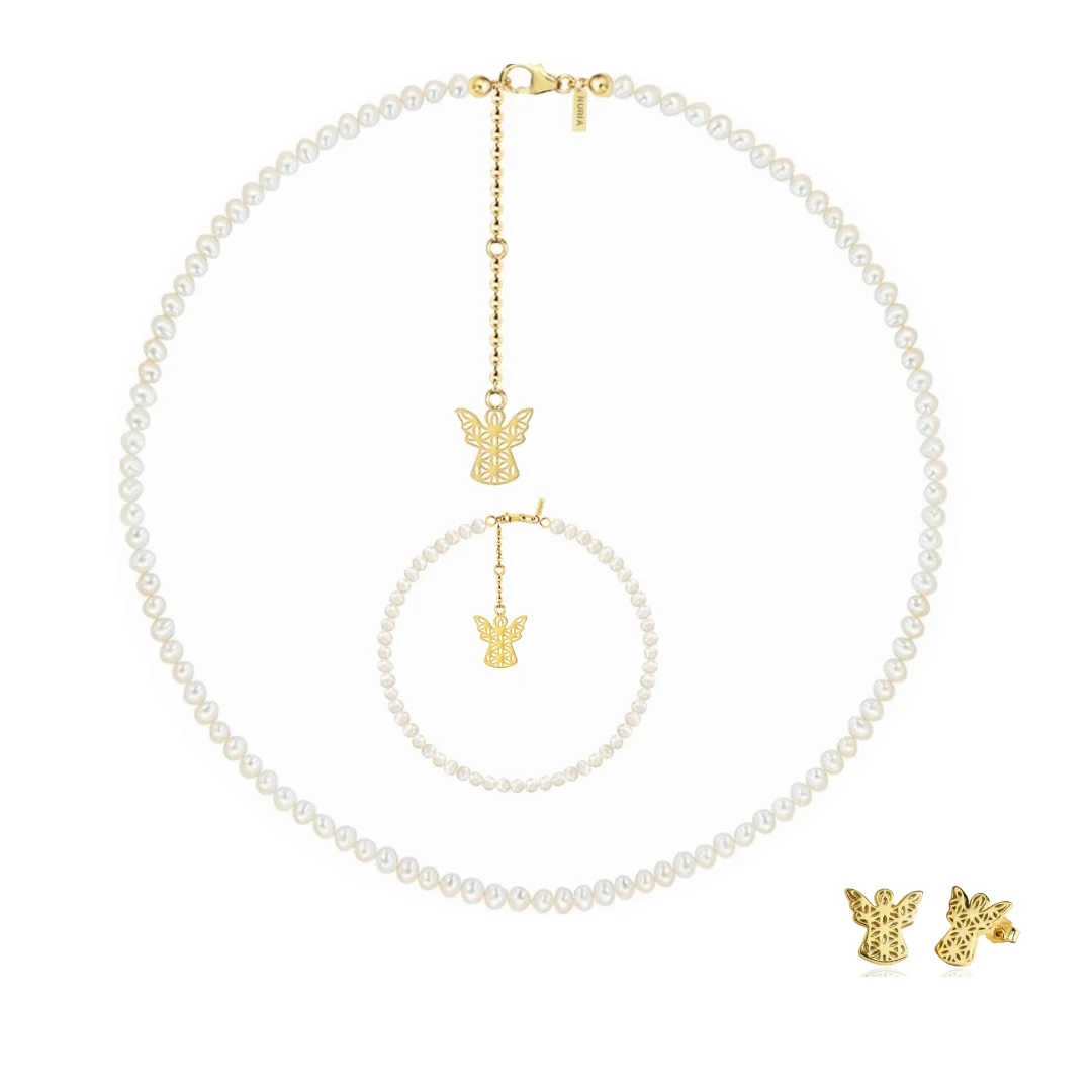 Set Colier, Brățară și Cercei din argint cu perle naturale de cultură mici Înger Auriu