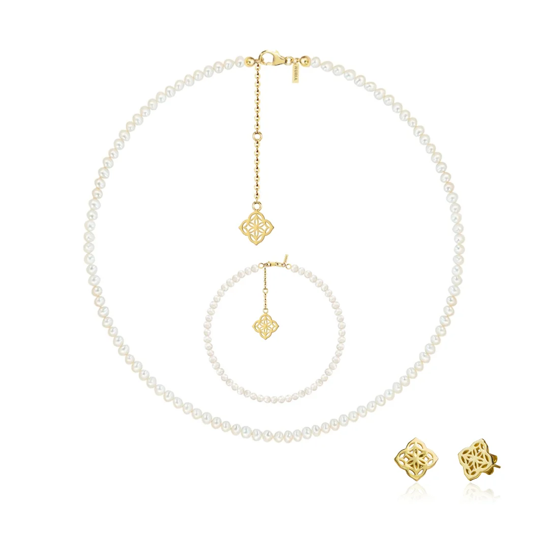 Set Colier, Brățară și Cercei din argint cu perle naturale de cultură mici Inimă Auriu